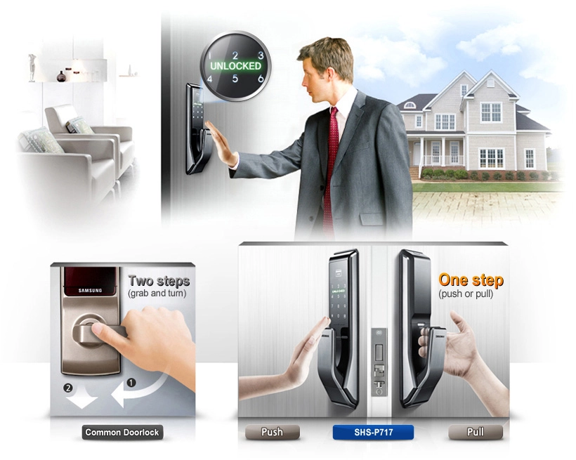 Samsung SHS-P717 được thiết kế chất liệu hợp kim tinh xảo hàng đầu trên thế giới, mặt kính bảo vệ cường lực chắc chắn, đem lại độ bền ổn định cao cho gia đình bạn.Bạn có thể mở rộng bằng cách kết nối với điều khiển từ xa hoặc chuông cửa màn hình SamSung.